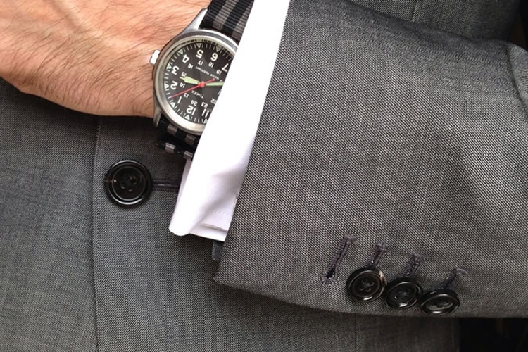 Những bộ suit bespoke (may đo) luôn có hàng khuy ngay cổ tay áo khoác, nó là một di sản từ xa xưa khi đồ suit là thứ trang phục hàng ngày của nam giới. Bất kể là người lao động chân tay, nhân viên bàn giấy hay thậm chí là bác sĩ giải phẫu thì đàn ông luôn mặc suit. Hàng nút ở cổ tay áo có tên là functioning cuff buttons, có thể mở ra để xắn ống tay áo lên để hạn chế việc vấy bẩn hay hư hỏng.