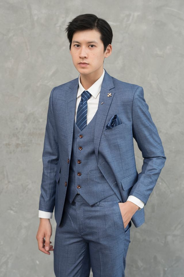 Áo sơ mi xanh và suit nam màu da
